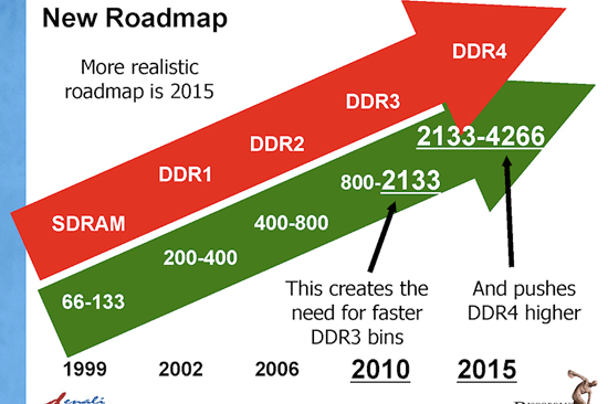 Des informations ont été dévoilées sur cette future norme lors de la conférence MemCon10 qui à eu lieu en juillet dernier. Doubler la bande passante disponible à une fréquence de cellule identique et baisser de la tension (de 1,5V à 1,2V et de 1,35V à 1,05V pour les basses tensions) sont les principaux objectifs de cette nouvelle version de la DDR.