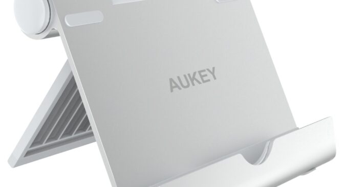 Le support de téléphone ou tablette Aukey est simple et sobre, mais également élégant (voir photo ci-dessus). Il existe en deux couleurs : gris ou argenté. Il possède des patins antidérapants afin de protéger votre appareil. Sa compatibilité est large et accepte des appareils jusqu’à 10 pouces.