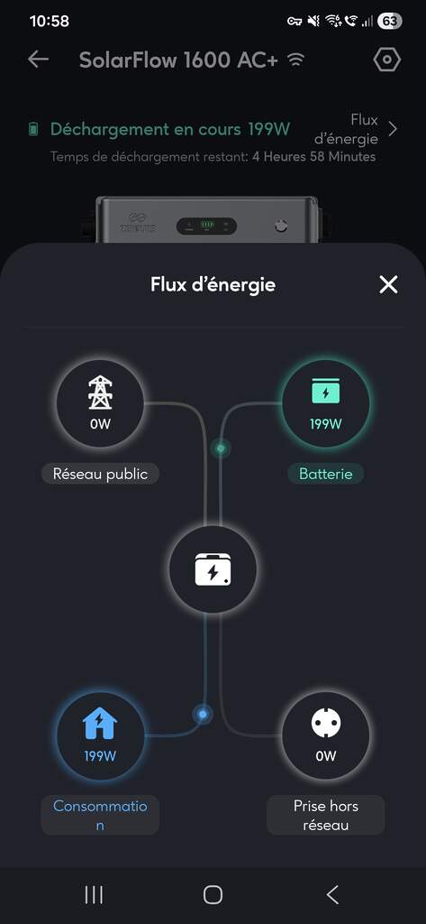 Autre point utile, la sortie hors réseau. Zendure annonce 1400 VA sur l’unité seule, 1600 VA avec batteries supplémentaires, et jusqu’à 2200 W en assistance réseau. Il faut lire cela comme une fonction de secours pour les usages essentiels, pas comme une promesse d’autonomie totale de la maison.