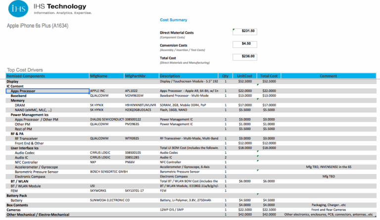 La société IHS technology vient de publier un tableau présentant le prix des pièces payé par Apple afin de fabriquer son nouvel iPhone 6S.